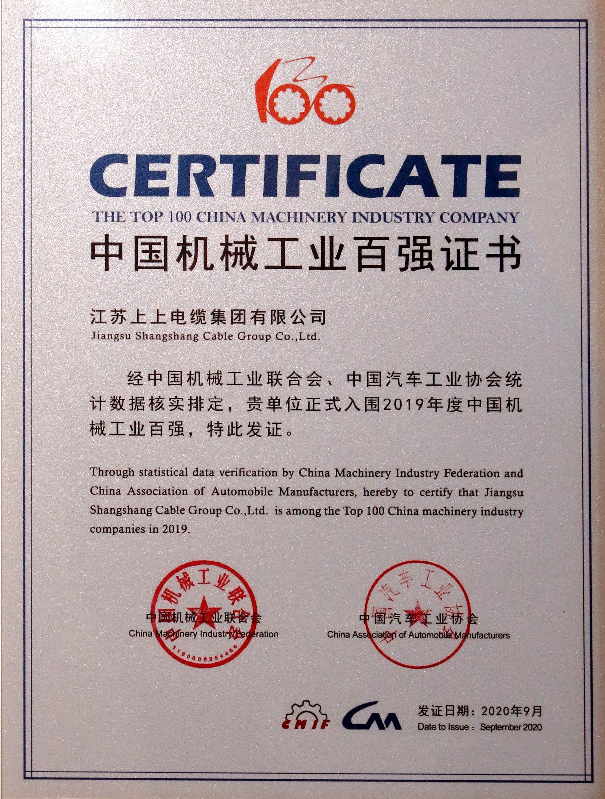 2020年9月16日,由中國機械工業聯合會、中國汽車工業協會聯合主辦的第十六屆“中國機械工業百強、汽車工業整車二十強、零部件三十強企業信息發布會”在重慶銅梁召開。會上揭曉了2019年中國機械工業百強榜單,江蘇上上電纜集團連續16年入選,位列第20位。