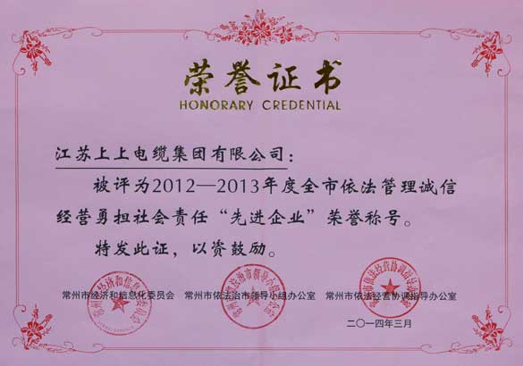 日前,江蘇上上電纜集團喜獲“2012-2013年度全市依法管理誠信經營勇擔社會責任‘先進企業’”榮譽稱號。